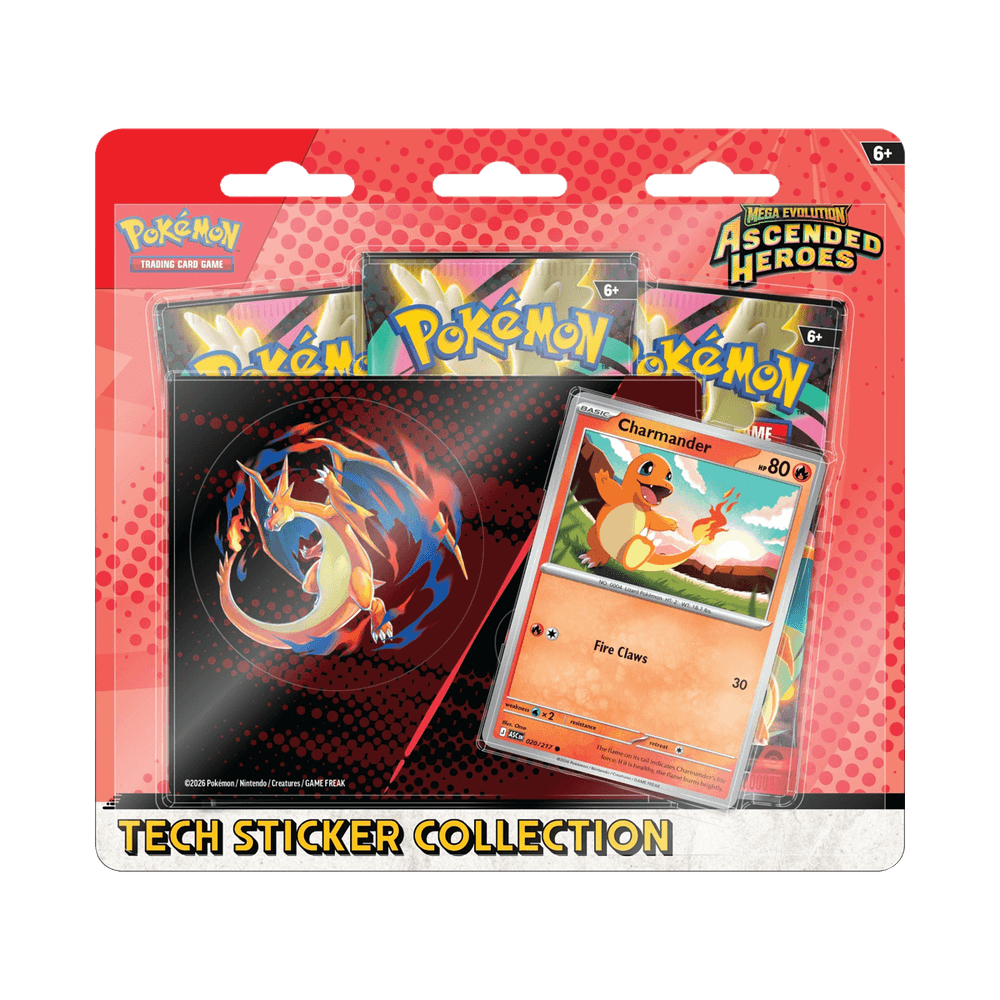Colección Tech Sticker Ascended Heroes Pokémon TCG Charmander ideal para fanáticos y coleccionistas del juego de cartas Pokémon. Este set incluye una carta promocional holográfica de Charmander, acompañada de una hoja de pegatinas tecnológicas con diseños inspirados en Charmander y Mega-Charizard Y, perfectas para personalizar dispositivos, cuadernos o accesorios.
