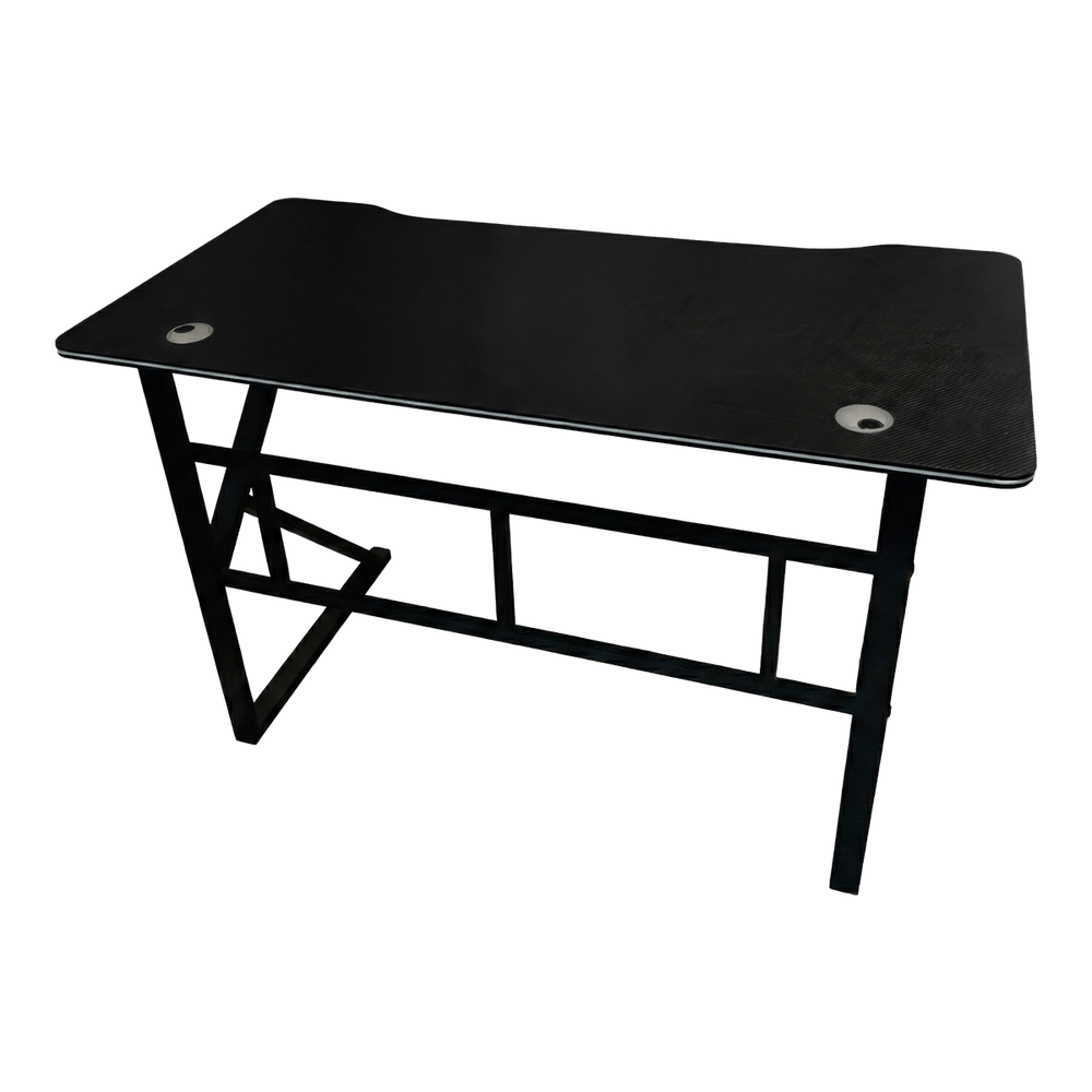 Escritorio gamer fabricado en MDF y metal, diseñado para brindar estabilidad y espacio adecuado para equipos de juego o trabajo. Su acabado en color negro ofrece un estilo moderno y resistente.