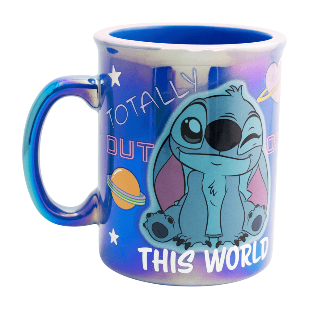Jarro iridiscente con capacidad de 790 ml, ideal para bebidas frías o calientes. Presenta un diseño de Stitch en tono morado que destaca por su estilo moderno.