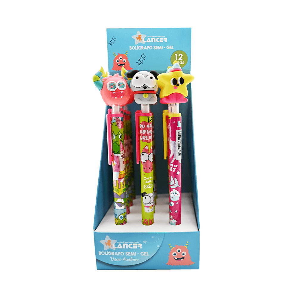 Pluma Semi Gel Retráctil de Punta Fina Diseño Monstruos con Tinta Azul