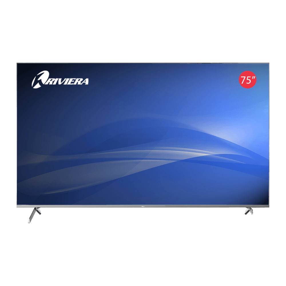 Televisor Riviera de 75" con resolución 4K y sistema Google TV, que ofrece acceso a tus aplicaciones y contenido favorito de manera intuitiva. Incluye asistente de Google integrado para un control por voz fácil y rápido, brindando una experiencia de entretenimiento moderna y completa.